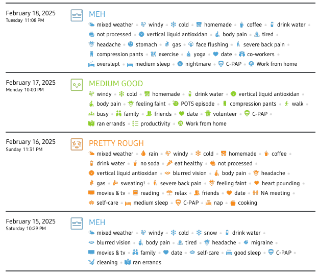 Tracking practices naturally change with symptom fluctuations and evolving priorities. Tools should support these shifts, allowing users to move between goals such as documentation, reflection, or trigger exploration.